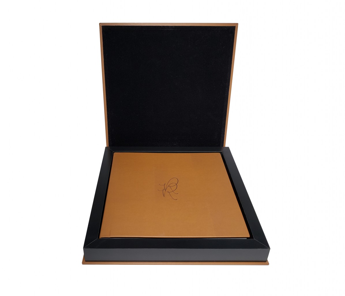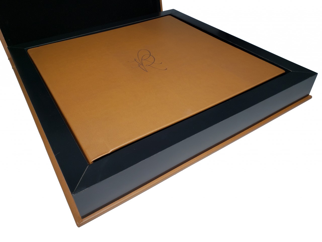 Estojo com fechamento ímã e base em madeira com revestimento preto laca.